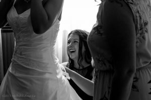 Il faut avouer que du côté des dames, il y a beaucoup plus de petits détails auquel il faut penser (et ne pas oublier).  En fait, de par la nature des vêtements, la robe de la mariée demande plus de manipulations.  C’est aussi un moment intéressant parce qu’il arrive de petites embûches sur l’ajustement final.