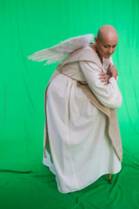 L’étape suivante était de faire les photos avec mon modèle en studio. Pour bien découper l’image et ne garder que le modèle, j’ai utilisé un fond vert; le même procédé qu’au cinéma. J’ai essayé plusieurs dispositions: un banc haut pour simuler un vol (sur le ventre), debout, etc. Finalement, j’ai opté pour la photo avec l’ange en petit bonhomme sur un petit banc. Mon modèle avait déjà fait de la photo et avait une certaine expérience: elle m’a offert de belles expressions !